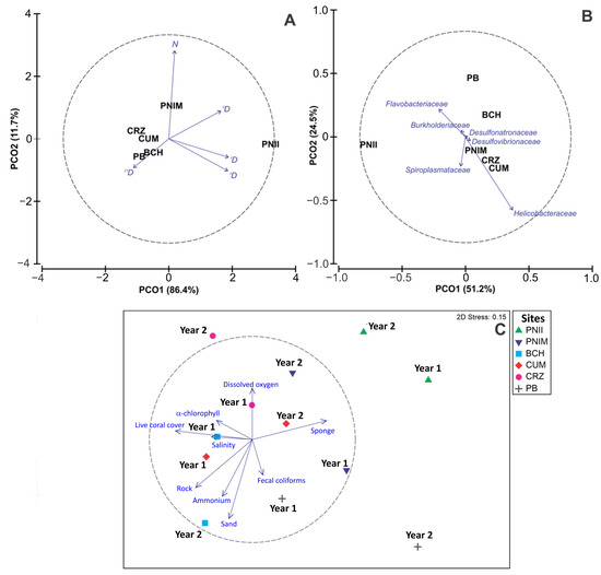 Principal coordinate analysis (PCO) ordinations of (A) alpha diversity (N, 0D, 1D, 2D, 21D); (B) composition and abundance of the families (blue arrows) of the bacterial assemblage associated with the sea urchin T. roseus per site. (C) Non-metric multidimensional scaling (nMDS) ordination of environmental variables at the site level by year. Codes: PNII: Isla Isabel National Park; PNIM: Islas Marietas National Park; BCH: Islas e islotes de Bahía Chamela Sanctuary; CUM: Bahía Cuastecomates-Punta Melaque; CRZ: Carrizales; PB: Punto B; Year 1: 2017–2018; Year 2: 2018–2019.
