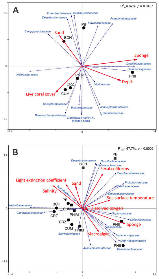 Spatial RDA ordination was shown to be a significant model (p-value = 0.0437) and R2adj = 62.0% (Figure 4A). The best combination of variables predictive of spatial change in the bacterial assemblage consisted of depth and live coral, sand, and sponge covers (Figure 4A and Table S1). Sponge cover was the only significant individual environmental variable (Table S8). The PNII was characterized by the highest sponge cover and average depth, which were positively related to higher abundances of Desulfobacteraceae and Flammeovirgaceae families and negatively related to the Helicobacteraceae family (Figure 4A). The highest live coral cover correlated with CUM and CRZ, followed by PNIM. These sites were mainly associated with the families Spiroplasmataceae and Thermoactinomycetaceae. In contrast, sites BCH and PB presented the highest sand cover. BCH was associated with high abundances of Campylobacteraceae and Desulfonatronaceae. PB correlated positively with Enterobacteriaceae, Desulfovibrionaceae, and Flavobacteriaceae; however, it correlated negatively with Burkholderiaceae and Clostridiales Family XI Incertae Sedis.