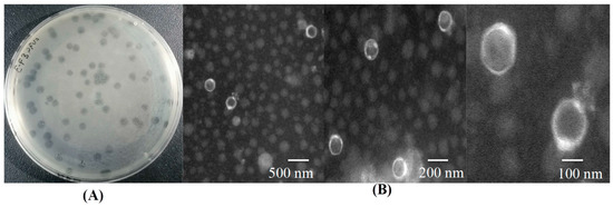 Figure 1. EFP6 screening. (A) Plaque characteristics and (B) morphology observed via transmission electron microscopy. Scale bar indicates 500, 200, and 100 nm, respectively.