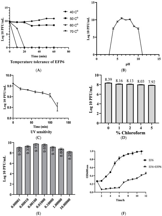 Figure 2. Phage EFP6 physiochemical influences. (A) Phage EFP6 temperature stability. (B) Phage EFP6 stability at varying pH values. (C) Sensitivity of EFP6 to UV radiation. (D) Effect of various percentages of chloroform on EFP6. (E) Optimal multiplicity of infection of bacteriophage EFP6. (F) Bacteriostatic activity of EFP6.