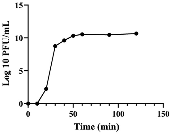 We adapted the methodology outlined in [38]. In brief, bacteriophage EFP6 was utilized to infect host bacteria EF6 (with an OD600 value of 0.5). The absorption process was conducted at 37 °C for 10 min; unbound bacteriophages were discarded by centrifugation and the pellets were re-suspended in 5 mL of a sterile BHI medium. Samples were collected at 9 different time intervals (0 min, 10 min, 20 min, 30 min, 40 min, 50 min, 60 min, 90 min, and 120 min) followed by centrifugation at 12,000 rpm for 10 min at 4 °C. Subsequently, the bacteriophage titer was promptly determined using the double-layer agar plate method. Each experiment was conducted with three replicates. The ratio of the average phage titer value during the plateau phase to the average titer value of the incubation period was used to determine the phage burst size.