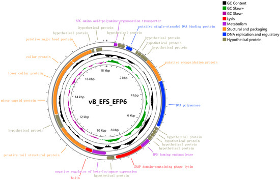 The genome of phage EFP6 spans 18,147 base pairs, with a composition of adenine (A) at 33.96%, thymine (T) at 32.83%, cytosine (C) at 16.08%, and guanine (G) at 17.13%, resulting in a GC content of 33.21% (Figure S1). It comprises 25 open reading frames (ORFs), with 15 ORFs assigned functions and the remaining 10 designated as hypothetical proteins. No tRNA genes were identified within the genome. A BLAST homology analysis classifies phage EFP6 within the order Caudovirales and the Autographiviridae family, specifically as a member of short-tailed bacteriophages.