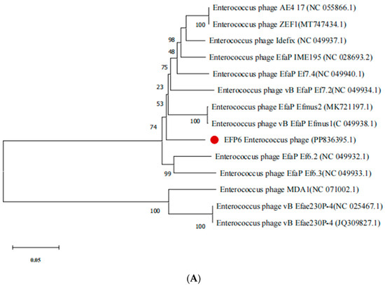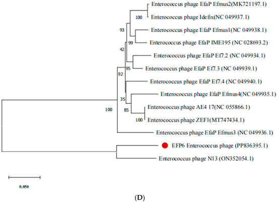 The DNA polymerase (ORF8), lysin (ORF14), tail protein (ORF18), and capsid protein (ORF20) of phage EFP6 are closely related to those of E. phage EfaPEf 6.2 (NC 049932.1), E. phage Efae 230P4 (NC 025467.1), and E. phage N3 (ON352054.1), respectively, according to an analysis of the evolutionary relationships between phage EFP6 and other phages (Figure 5A–D). The reason for this resemblance could be that when many phages infect the same host cell, mobile genes are transferred during proliferation. This leads to the accumulation of mutations in common gene sequences between phages that target the same disease. Since other phages targeting Enterococcus spp. developed different clusters, phage EFP6 clustered with E. faecalis phages E. phage Efae 230P4 and E. phage N3.