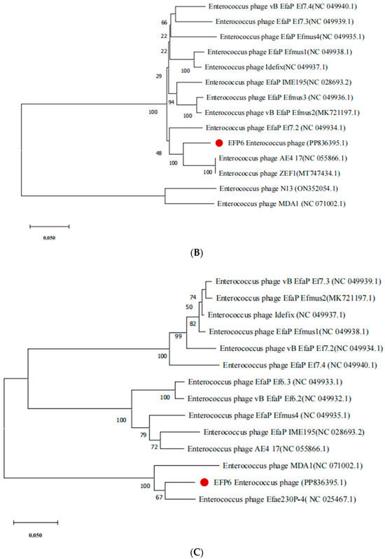 The phylogenetic analysis of EFP6 was conducted, using DNA polymerase (ORF8), lysin (ORF14), tail protein (ORF18), and capsid protein (ORF20) [28]. Protein sequences were initially compared using the BLAST tool on the NCBI website, and sequences from phages with high homology were selected. A phylogenetic tree was then constructed using Mega 11.0 software [45].