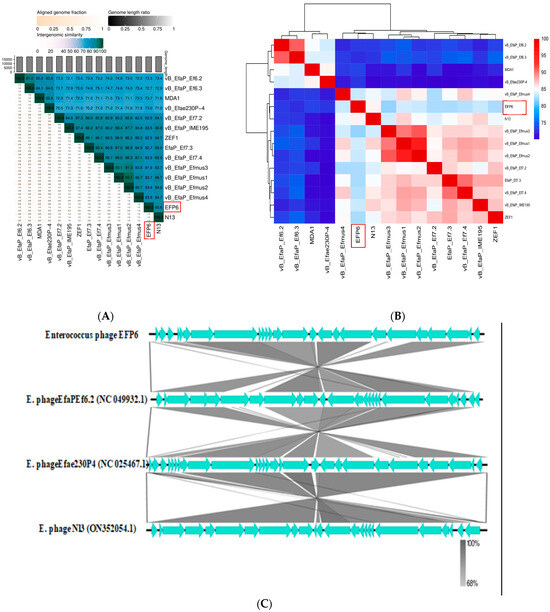 Figure 6. EFP6 bacteriophage homology; (A) percent similarity of phage EFP6 with other closely related Enterococcus phages, (B) heat map based on similarity percentage, (C) genome sequence comparison of EFP6 with closely related phages.