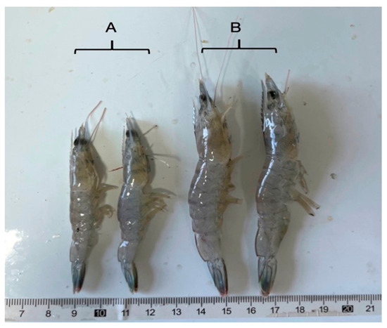 Shrimp with different concentrations of EHP infection. Note: A is the shrimp sample with a high concentration of EHP infection; B is the shrimp sample with a low concentration of EHP infection.