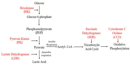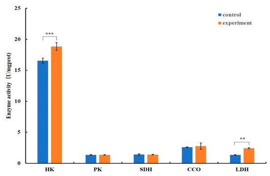Enzymes related to energy metabolism, including cytochrome c oxidase (CCO), hexokinase (HK), succinate dehydrogenase (SDH), lactate dehydrogenase (LDH), and pyruvate kinase (PK), were detected in this study (Figure 2). The CCO activity assay was slightly modified based on the method of Liu et al. [14], and the oxidation of reduced cytochrome c was measured at a wavelength of 550 nm. The HK assay method was carried out based on the previous method reported by Eleazar [15]. SDH, LDH, and PK were determined using test kits purchased from Nanjing Jiancheng Bioengineering Institute.