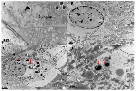 Histopathological analysis of hepatopancreatic tissues at different concentrations of EHP infection by transmission electron microscopy. Notes: (A,B) represent low-concentration EHP infection groups; (C,D) represent high-concentration EHP infection groups; NC means cell nucleus; red arrows represent EHP; white arrows represent mitochondria.