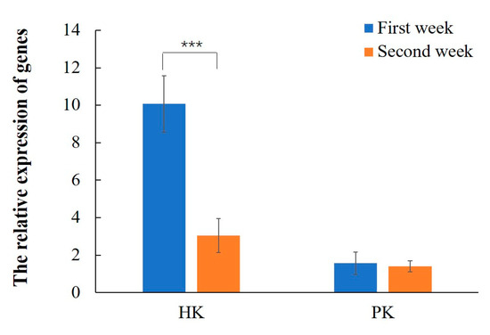 In the EHP artificial infection experiment, quantitative results showed EHP content in the second week was 185-fold higher than that in the first week, which indicated the EHP content increased significantly with the increase in infection time. Fluorescence quantitative results of gene expression show that the key gene hexokinase was significantly upregulated in the diseased shrimp (Figure 4). The relative expression level of hexokinase in the first week was higher than that in the second week (p ≤ 0.001).