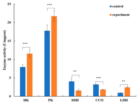 Enzyme activity analysis in the infected shrimp in the first week. Notes: The control group represents the healthy group (orange ) and the experiment group represents the artificial infection group (blue); ** means p ≤ 0.01, *** means p ≤ 0.001; HK is hexokinase, PK is pyruvate kinase, SDH is succinate dehydrogenase, CCO is cytochrome c oxidase, and LDH is lactate dehydrogenase.