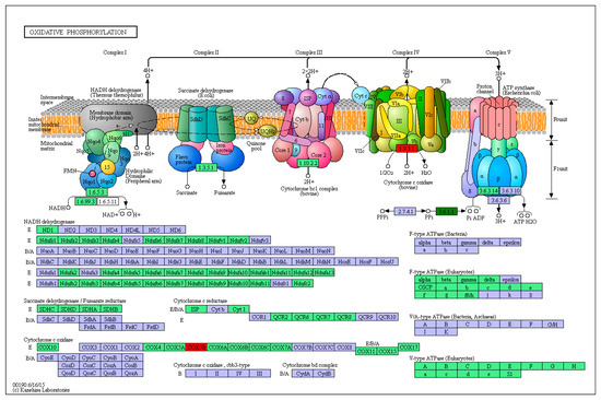DEGs involved in oxidative phosphorylation pathway in group C vs. group A. Notes: Red indicates upregulated DEGs; dark green represents downregulated DEGs.