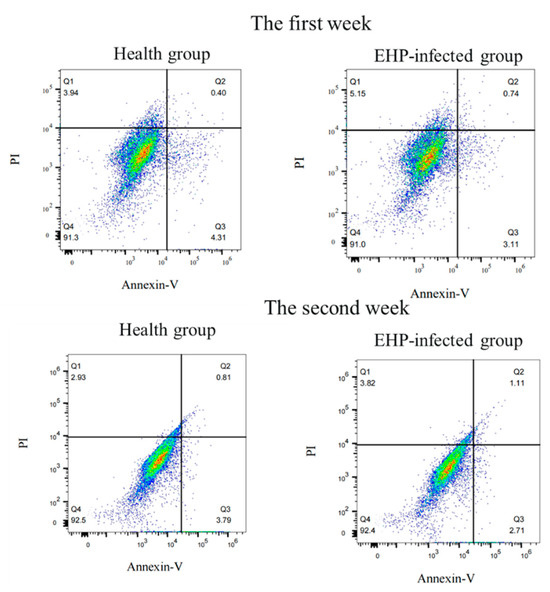 During the first and second weeks of infection, primary hepatopancreas cells were isolated from both infected and healthy groups of shrimp to detect the level of cell apoptosis. The results showed no significant difference in cell apoptosis in the shrimp infected with EHP during the first and second weeks (Figure 8).