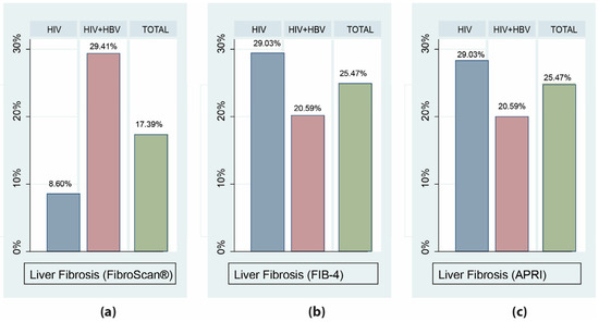 Proportions of patients with significant liver fibrosis among patients living with HIV alone or co-infected with HBV, as assessed by FibroScan® (a), FIB-4 (b), and APRI scores (c).