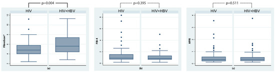 For patients living with HIV, the FIB-4 (p = 0.005) and APRI (p = 0.004) scores showed significant sex differences (Figure 3), whereas in the co-infected group, both the FibroScan® and APRI scores showed significant differences (p = 0.025 and p = 0.021, respectively). The results of the sex distribution of liver fibrosis suggest that male patients, particularly those co-infected with HBV, may have a higher degree of liver fibrosis than female patients, although this trend does not apply uniformly across all fibrosis scoring methods.
