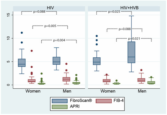 By analyzing the sex distribution of fibrosis scores, we observed higher scores in men, which reached statistical significance for FIB-4 (p = 0.004) and APRI (p = 0.005) scores in the patients living with HIV and FibroScan® groups (p = 0.025), and APRI (p = 0.021) scores in the co-infected group.