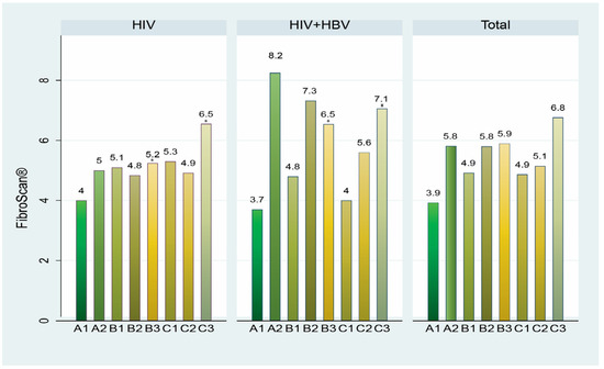 Transient elastography scores were analyzed according to clinical and immunological AIDS staging (Figure 4). In patients living with HIV, the highest mean score was observed in C3 (6.5) and the lowest in lot A1 (4). In patients co-infected with HIV and HBV, the scores were generally higher, ranging from 3.7 in patients with clinical and immunological HIV infection stages A1 to 8.2 in those with stage A2. There were significant differences between the TE measurements in monoinfected vs. co-infected patients in B3 and C3 clinical and immunological stages (Figure 4).