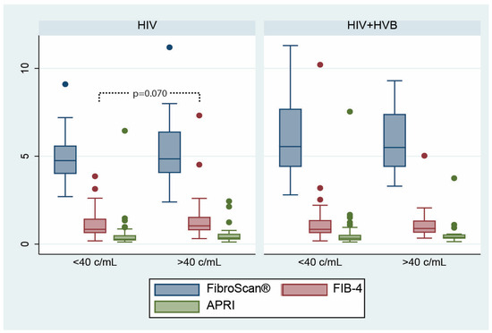 None of the fibrosis scores showed a statistically significant difference based on the current viral load for either the HIV-only or HIV+HBV cohorts (Figure 5), although in patients living with HIV, the FIB-4 score was higher in patients with detectable HIV-ARN levels, and this difference approached statistical significance (p = 0.07).