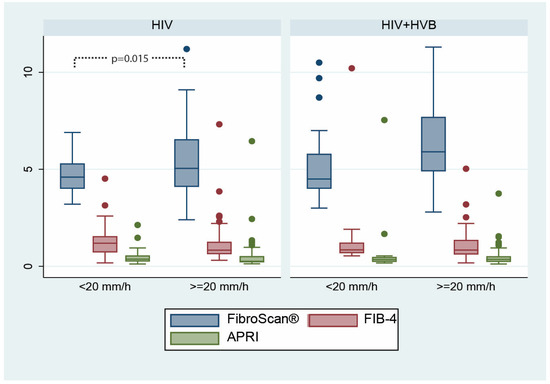 Within the HIV mono-infected group, we observed a significant difference in FibroScan® scores between patients with ESR < 20 mm/h and those with ESR ≥ 20 mm/h (Figure 6), suggesting that higher ESR levels may be associated with increased liver fibrosis as measured by FibroScan®. Regarding the FIB-4 and APRI scores and all fibrosis measures within the HIV+HBV co-infected group, there were no significant differences based on ESR levels. These findings suggest that, while ESR might be correlated with certain fibrosis markers in patients living with HIV, this correlation does not hold in the presence of HBV co-infection. An alternative explanation is that other fibrosis markers (FIB-4 and APRI) are less sensitive to changes associated with ESR.