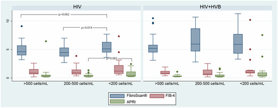 For the HIV mono-infected group, significant differences in liver fibrosis scores, as measured by FibroScan®, were found between the CD4+ cell count categories (Figure 7). The Kruskal-Wallis test showed a significant difference among the CD4+ cell count categories (p = 0.0284). Dunn’s post hoc multiple comparison test revealed significant differences between the <200 cells/mL group and—200–500 cells/mL group (p = 0.0138). This suggests that CD4+ cell count may correlate with the severity of liver fibrosis in HIV patients without HBV co-infection. For the HIV plus HBV co-infected patients, no significant differences were found across CD4+ cell count categories for any of the fibrosis measures, indicating that CD4+ cell count levels might not have the same association with liver fibrosis severity in these patients.