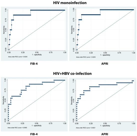 Overall, although the APRI and FIB-4 scores were highly correlated and had high specificity, their sensitivity was relatively low. This suggests that they may be useful in ruling out advanced fibrosis but not in making a definitive diagnosis. Given these findings, a multimodal approach that incorporates these scores alongside FibroScan® may provide a more comprehensive assessment of liver fibrosis in patients living with HIV and HIV+HBV co-infected patients.
