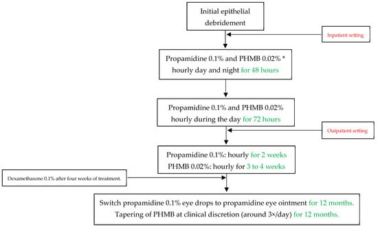 All patients underwent conservative treatment according to our standard of care at the University Hospital Zurich, as displayed in Figure 1. The antiamoebic treatment included initial epithelial debridement to reduce pathogen density and to improve drug penetration. In an inpatient setting, we first applied propamidine 0.1% and polyhexamethylene biguanide (PHMB) 0.02% eye drops hourly for 48 h (during the day and at night), and then reduced the frequency to hourly during the awake time for another 72 h. After five days and in an outpatient setting, we further reduced propamidine to every other hour for two weeks and PHMB to every other hour for three to four weeks, depending on the severity of the infectious keratitis and the treatment toxicity. We then switched the propamidine eye drops to propamidine ointment, which we advised the subjects to apply at night. We tapered PHMB at clinical discretion, and it was mostly used three times per day for twelve months. We regarded chlorhexidine 0.02% eye drops as equivalent to PHMB, which we used in the same regimen in case PHMB was not readily available. However, this case never occurred, so that no patients had to be treated with chlorhexidine. We produced propamidine in the cantonal pharmacy in Zurich as a magistralis formulation, and only if this was otherwise not possible did we resort to the commercial product Brolene® (0.1% propamidine isethionate, Thornton & Ross, West Yorkshire, UK). After four weeks of treatment, we introduced dexamethasone 0.1% eye drops to account for immunogenic reactions during the treatment. The dosage of dexamethasone was based on clinical judgement, and we stopped the corticosteroid treatment at least one month before discontinuing antiamoebic therapy. During the treatment period, we paid particular attention to initiating adequate pain relief with systemic non-steroidal anti-inflammatory drugs or opioids if necessary, as well as administering cycloplegic eye drops if this was helpful.