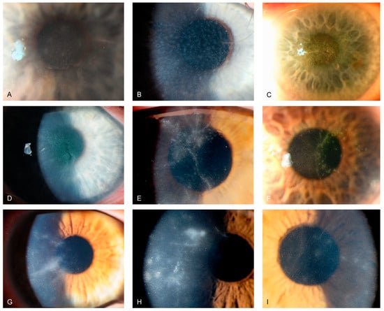 Slit-lamp photographs of different patients with Acanthamoeba keratitis, obtained by direct illumination or scleral scatter. (A–C) show greyish epithelial opacifications and microcysts (“dirty epithelium”). (D–F) display pseudo-dendritiformic epitheliopathy. (G–I) depict perineural infiltrates (“radial keratoneuritis”).