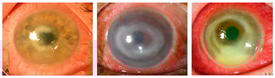 Similar to findings from the literature [8,30,31], we also found a delayed time to diagnosis at our clinic. Based on clinical findings, Acanthamoeba keratitis can be classified into early, advanced, and late stages. The early clinical signs may begin within the first two weeks of infection and mainly include epithelial changes such as punctate epithelial lesions, microcystic changes, or pesudodendritiformic epitheliopathy, which are not specific to Acanthamoeba and may lead to misdiagnosis of other, more common types of microbial keratitis [32,33,34]. Although not pathognomonic, as it also occurs in Pseudomonas keratitis, infiltration along the corneal nerves (known as radial keratoneuritis) may be one of the most seminal clinical signs in the early stages of infection [35]. A protracted clinical course may lead the patient to develop severe sequelae, such as deep stromal ring infiltrates or corneal melting, often occurring within the first month of the disease and requiring more invasive treatment options such as therapeutic keratoplasty [34]. Late signs may follow months after the primary infection and include sequelae such as scleritis, sterile anterior uveitis with subsequent anterior synechiae, secondary glaucoma, atrophic iris changes, cataracts, and rarely retinal vasculitis, and chorioretinitis [34]. When Acanthamoeba keratitis is suspected, ophthalmologists should have a low threshold for referring patients to medical facilities with appropriate diagnostic tools, such as in vivo confocal microscopy, PCR availability, or increased clinical expertise, to ensure timely management, ultimately improving visual prognosis.