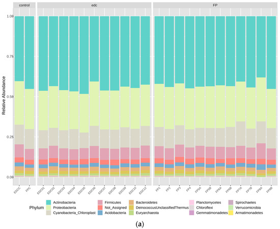 Procaryota composition of the controls, EDCs, and paper filters. The bar plots show the relative abundances (%) at phylum (a), class (b), and order levels (c). C—controls; EDCs—Electrostatic dust cloths; FP—Filter papers.
