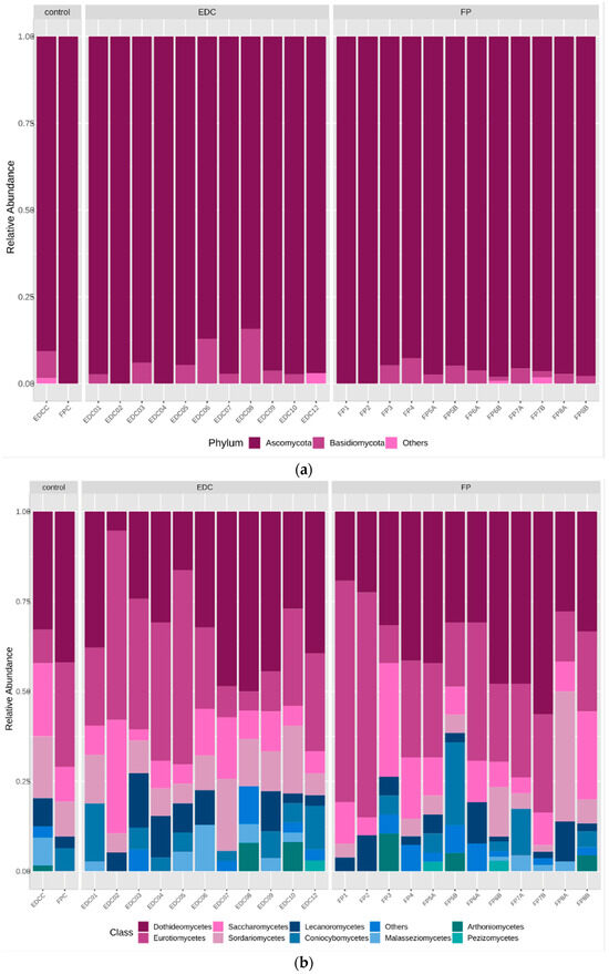 Eucaryota composition of the controls, EDCs, and Filter papers. The bar plots show the relative abundances (%) at phylum (a), class (b), and order (c) levels. C—controls; EDCs—Electrostatic dust clothes; FP—Filter papers.