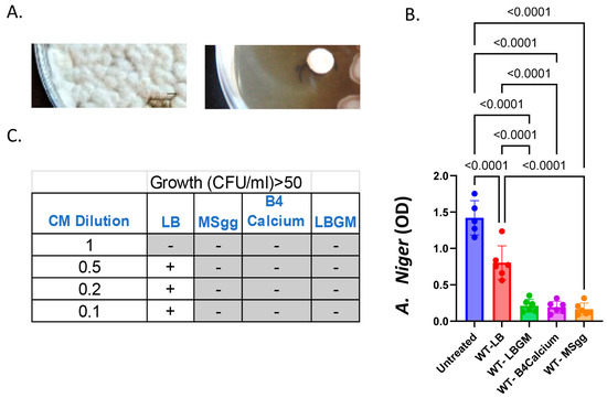 In suspension, our results indicated that the secreted products of the wild-type B. subtilis significantly inhibited the growth of A. niger (Figure 1B). This effect was observed similarly on all rich biofilm-inducing media, rich, e.g., LBGM, B4-Ca [46] and a defined medium (MSgg [47]). While an antifungal effect (about 40%) was obtained with the conditioned medium obtained from the LB (Luria Bertani) medium, it was significantly smaller than the effects in LBGM, BR-Ca, and MSgg (Figure 1B). The results were also evident when the colony-forming units of A. niger treated with different dilutions of the conditioned medium of the bacterium from each condition were tested (Figure 1C). Previous findings indicated that the rich medium LB does not allow the transcriptional activation of genes associated with biofilm development [44,51]. Therefore, we tested whether the significant inhibition of A. niger can be attributed to one or more previously described anti-fungal biosynthesis clusters, associated with biofilm formation [24].