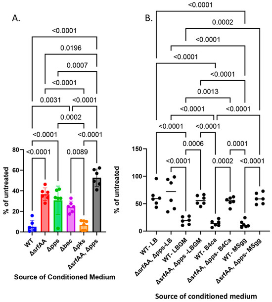 Collection of the conditioned medium. B. subtilis WT or indicated mutants were isolated on a solid LB plate, inoculated into 3 mL of LB broth, and grown overnight 30 °C on indicated media. The conditioned medium was centrifuged at 8000 rpm for 10 min; supernatant was removed and filtered through a 0.22 µm filter. The conditioned medium’s acidity was measured using the pH meter (Mettler Toledo) [48].