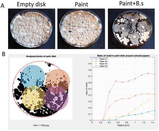 Evaluating the anti-fungal properties of commercial paints. To inoculate the A. niger and generate a homogeneous loan, 100 μL of A. niger suspension (105 spores/mL) was spread over an empty LBGM Petri dish. Plates were dried thoroughly and uniformly in a biological hood. The overnight culture of B. subtilis was either mixed or not with paint. Sterilized Whatman® paper (Sigma Aldrich, St. Louis, MO, USA) was perforated to create symmetrical points for subsequent use. A 1:1 mixture of bacteria and paint (500 μL each) (either anti-fungal paint Supercryl Acrynol—Tambour or a similar paint lacking the fungicide Supercycle) was prepared. Symmetrical points were dipped into the tube containing the color and B. subtilis before being placed inside the Petri dishes. B. subtilis was inoculated at four symmetrical points, 2.5 cm from the center.