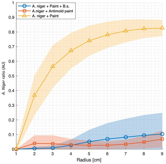 The process is shown in Figure 3B and detailed in supporting information. In short, the algorithm was based on high-resolution images of mold B. subtilis interactions, calculating mold growth in treated and untreated samples as a function of the distance of the mold from the paint measured in cm. [For details, please refer to Materials and Methods] Our results indicated that B. subtilis was an effective agent in reducing A. niger spread through multiple plates (Figure 3A,B). B. subtilis application was even efficient compared with a commercial mold containing the broad-spectrum anti-fungal biocide (Figure 4). Results were reproduced in independent experiments and with multiple technical repeats, suggesting high compatibility of this bacterium as an anti-mold paint additive in industrial settings.