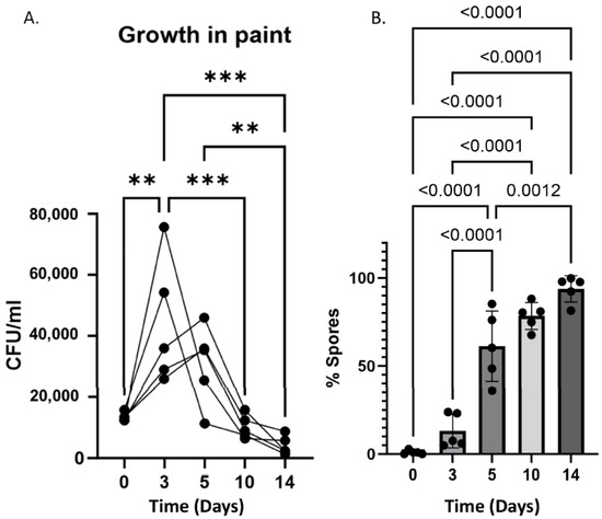 Viability and Sporulation of B. subtilis in paint. The paint–bacteria solution was prepared at indicated times, as described in Figure 4. After intense vortexing, 1 mL of the solution was taken. A total of 500 µL was mildly sonicated and evaluated for overall CFU numbers/mL in the solution using serial dilutions and plating (A). The remaining solution was heat-activated (80 °C, 30 min) to eliminate non-sporulating cells before plating versus the untreated half. The percentage of spore cells was calculated (B) by calculating the ratio between spores and untreated cell counts. The graphs represent the mean and standard deviation of five independent repeats. ** represents <0.01, *** <0.001.