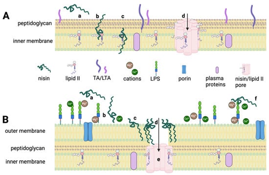 Pathways of nisin inhibition against Gram-positive (A) and Gram-negative (B) bacteria.