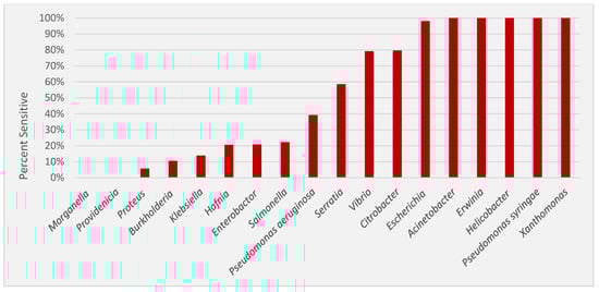 Low levels of sensitivity were defined as 1% to < 25% of the strains sensitive. Four genera fell into this category. Ten of the forty-eight strains of Enterobacter (20.8%) were sensitive, representing four species (E. cloacae, E. taylorae, E. aerogenes, and E. agglomerans) with a mean MIC of 296.76 μg/mL. Eight of the thirty-five strains of Hafnia alvei (20.5%) were sensitive with a mean MIC of 347.46 μg/mL. Nine of the sixty-five strains of Klebsiella (13.8%), which included two species (K. pneumoniae and K. oxytoca) were sensitive, with a mean MIC of 304.03 μg/mL. Two of the nineteen strains of Burkholderia (10.9%), which included four species (B. cenocepacia, B. cepacia, B. multivorans, B. dolosa) were sensitive with a mean MIC of 423 μg/mL. Two of the thirty-five strains of Proteus (5.7%) representing two species (P. vulgaris and P. mirabilis) were sensitive with a mean MIC of 105.7 μg/mL.
