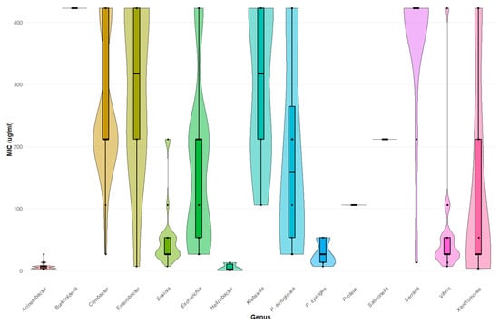 For ease of comparison, Figure 2 provides a ranked order of sensitivity for the 17 genera examined. Four genera displayed sensitivity to nisin in all strains tested (Acinetobacter, n = 67; Erwinia, n = 21; Helicobacter, n = 5; Xanthomonas, n = 11). Only two possessed no detectable nisin activity (Providencia, n = 13 and Morganella, n = 13) at the highest concentration employed. Figure 3 is a violin plot of nisin MIC which provides a snapshot of the relative MIC values for each genus, and plots the median and quartile MIC values, as well as the distribution of strains along these values.