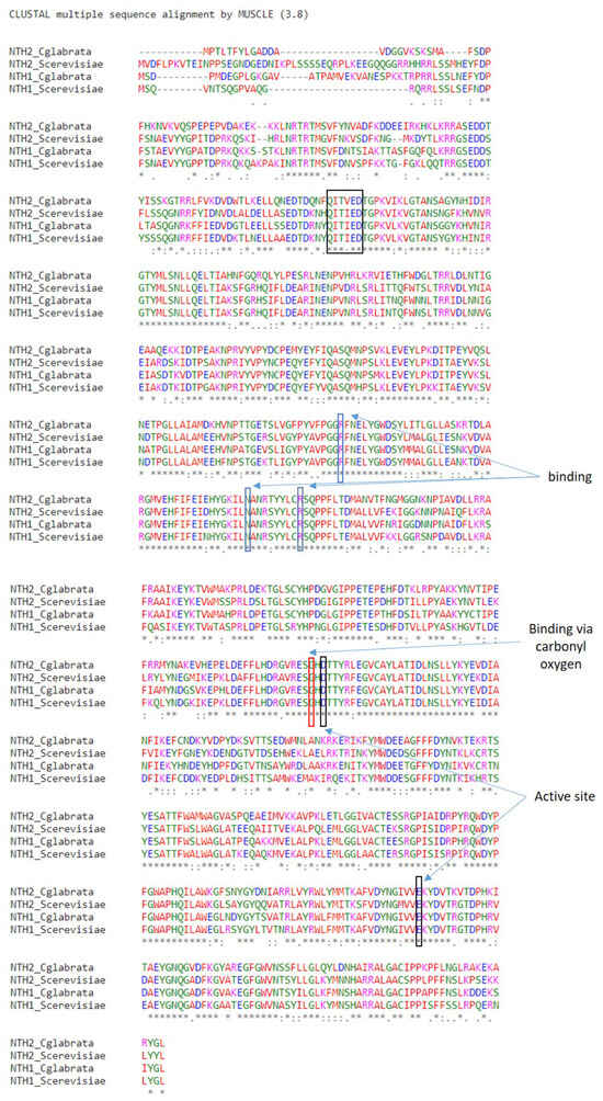 Alignment of the amino acid sequences corresponding to Nth1 and Nth2 enzymes in the yeasts Candida glabrata and Saccharomyces cerevisiae. The alignment was performed using the MUSCLE program (Multiple Sequence Comparison by Log-Expectation). The text indicates the residues that are identical (*), conserved substitutions residues (:) and semi-conserved substitutions (.). Boxes indicate the essential residues involved in trehalose binding and catalytic activities.