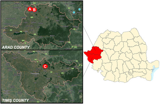 Between 2017 and 2021, a considerable number of European fallow deer (n = 1881) were hunted during organized hunting activities, within three of the most important hunting grounds in the Arad and Timiș counties (Western Romania). The hunting locations are called Socodor (A), harboring the largest fallow deer population in Romania [23], Chișineu Criș–Sălișteanca (B), and Nadăș (C) (Figure 1). The harvesting quota was documented annually for each of the three hunting reserves. Thus, samples were collected and analyzed from a total of 120 animals.