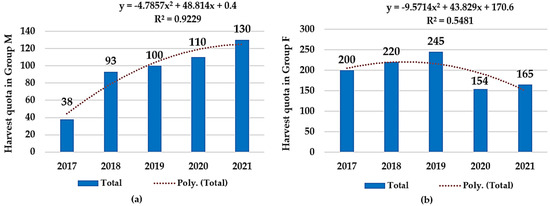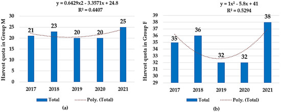 Figure 3. A comparison in harvesting quota dynamics between 2017 and 2021 in Hunting Ground Chișineu Criș–Sălișteanca: (a) Group M—slightly ascending trend; (b) Group F—slightly ascending trend.