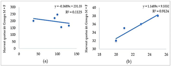 Figure 4. Relationship between the harvesting quota dynamics of Group M and Group F between 2017 and 2021: (a) in Hunting Ground A; (b) in Hunting Ground B.