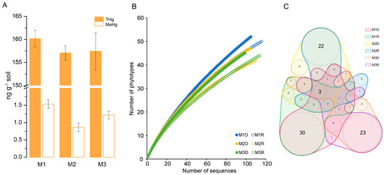A physicochemical parameters analysis showed a weakly acidic (pH 6.67~6.83) and reduced (Eh −121~−107 mV) environmental background (Table S1). Various THg and MeHg contents (ng g−1 soil) were revealed in the sampling sites. The THg content (ng g−1 soil) in M1, M2, and M3 were 160.2 ± 4.8, 157.1 ± 1.5, and 157.4 ± 4.1, respectively, which were not significantly different from each other (p > 0.05), whereas the MeHg content (ng g−1 soil) in M1, M2, and M3 was 1.53 ± 0.13, 0.86 ± 0.12, 1.22 ± 0.11, respectively, which were obviously different from each other (p < 0.05) (Figure 2A). Thus, the MeHg contents were not consistent with the Hg contents in the sampling sites of mangrove sediments.