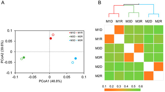 Principal coordinates analysis (PCoA) plot of thetaYC matrix distances for hgcA gene (M1D, M2D, and M3D) and transcript (M1R, M2R, and M3R)–harboring communities derived from different sampling sites of mangrove sediments (A). Hierarchical clustering heatmap derived from Bray–Curtis matrix distances of hgcA genes and transcript–harboring communities (B).