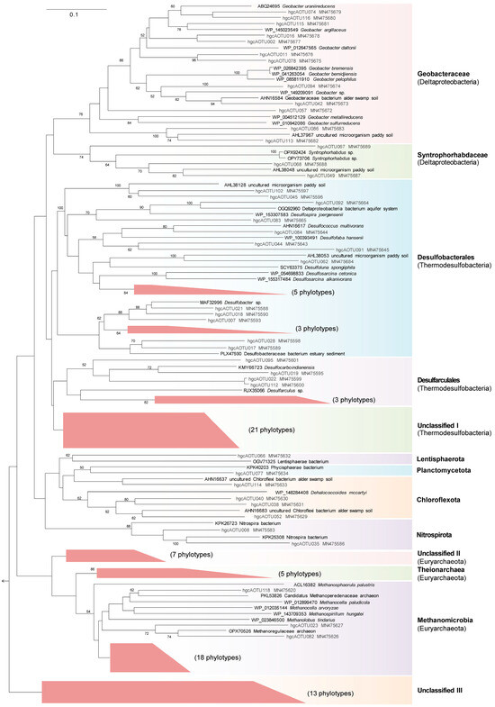 A phylogenetic analysis showed that all 118 hgcA phylotypes fell into 13 distinct clusters. These clusters included five Thermodesulfobacteria clusters [i.e., Geobacteraceae, Syntrophorhabdaceae, Desulfobacterales, and Desulfarculales (these four taxa were previously classified as Deltaproteobacteria [44]), and Unclassified I cluster], three Euryarchaeota clusters (i.e., Methanomicrobia, Theionarchaea, and Unclassified II cluster), one Chloroflexota cluster, one Nitrospirota cluster, one Lentisphaerota cluster, one Planctomycetota cluster, and the unclassified III cluster (Figure 4).
