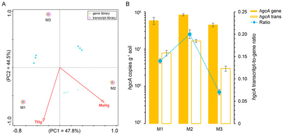 CCA between THg or MeHg content and the structure of hgcA genes or transcript library originated from the sampling sites M1, M2, and M3; the triangles represent hgcA phylotypes (A); quantitative abundance of hgcA genes and hgcA transcripts and the hgcA transcript–to–gene ratio from the sampling sites M1, M2, and M3 of mangrove sediments; the error bar represents the standard deviation (B).