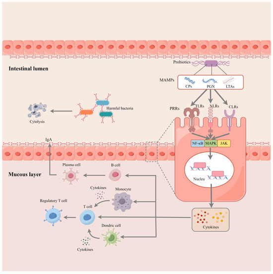 Figure 2 illustrates the role of probiotics in activating innate immunity. Probiotics possess conserved microbe-associated molecular patterns (MAMPs) [including cell wall polysaccharides (CPs), peptidoglycan (PGN), lipoprotein anchors, and lipoteichoic acids (LTAs)], which can interact with pattern recognition receptors (PRRs) [including the Toll-like receptors (TLRs), C-type lectin receptors (CLRs), and nucleotide oligomerization domain (NOD)-like receptors (NLRs)]. PRRs are broadly expressed in various cell types, including epithelial and immune cells. Thus, epithelial cells, dendritic cells, and monocytes can recognize probiotics or their molecules through pattern recognition receptors such as Toll-like receptors (TLRs), NOD-like receptors (NLRs), and C-type lectin receptors. This recognition triggers a signaling pathway (e.g., NF-κB and MAPK) that promotes the secretion of immune factors such as interleukins, tumor necrosis factors, interferons, transforming growth factors, and chemokines [58,59,60,61]. These cytokines build a regulatory network, activate the innate immune cells, and promote their differentiation and function [62,63]. In a mouse model, Liu et al. [64] found that L. casei M2S01 alleviated the symptoms of IBD by activating the T-regs and upregulating the levels of IL-10. Another trial in mice with IBD provides evidence of the generation of CD4+ CD5+ Foxp3+ T-regs in response to probiotic mixtures. The upregulated chemokines (CCL1 and CCL22) then recruit CD4+ Foxp3+ Tregs to the inflammatory sites and inhibit the progression of inflammation [65].