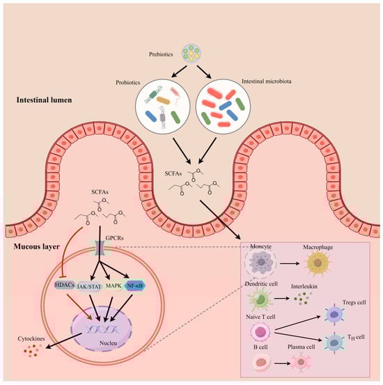 Modulation of intestinal mucous immune function by SCFAs produced by probiotics and prebiotics (by figdraw). Probiotics and intestinal microorganisms metabolize dietary fibers, such as prebiotics, to produce SCFAs, which pass through the intestinal epithelial layer into the mucous layer and modulate the function of innate immune cells. For instance, SCFAs can activate monocytes and dendritic cells to enhance their phagocytosis and secretion, promote the differentiation of T-lymphocytes to regulatory T cells and helper T cells, and promote the proliferation and differentiation of B-lymphocytes. In addition, SCFAs can bind to GPCRs and mediate the transcription and translation of cytokines (e.g., IL-12) through activating pathways such as JAK/STAT, NF-κB, and MAPK. On the other hand, SCFAs also act as inhibitors of HDACs to enhance the expression of immune factors.
