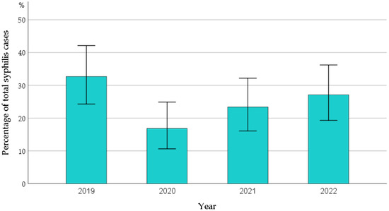 - European Centre for Disease Prevention and Control. Syphilis—Annual Epidemiological Report. 2022. Available online: https://www.ecdc.europa.eu/sites/default/files/documents/SYPH_AER_2022_Report_0.pdf (accessed on 11 May 2024).