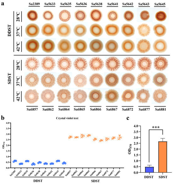 A comparison of biofilm formation between DDSTs and SDSTs. (a) Comparison of the biofilm morphology formed by DDSTs and SDSTs at three induction temperatures. Comparison of biofilm strength among individual isolates (b) and between the two groups (c) using crystal violet assay. Only the morphology of the biofilm is shown, and the size of the colonies is not displayed to scale. Three biological replicates were set up for each group, and “***” represents a p-value < 0.001.