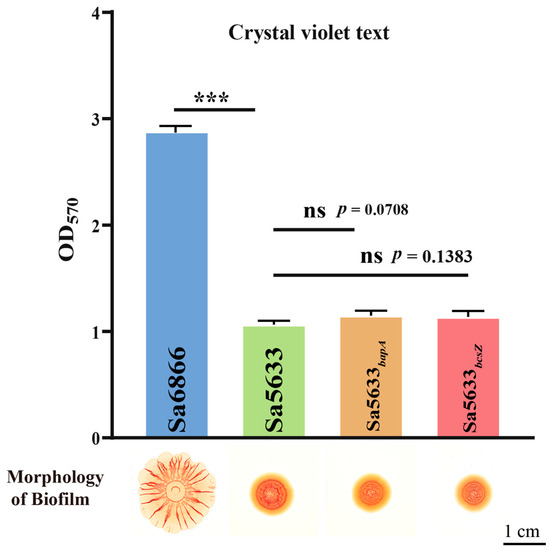 Sa5633 and Sa6866 were selected as representative strains for SDSTs and DDSTs to evaluate the impact of these SNPs. The ORFs of bapA and bcsZ from Sa6866 were replaced by homologous recombination at the same locus in Sa5633, generating the recombinant strains Sa5633bapA and Sa5633bcsZ. Induced under 28 °C and no-NaCl cultivation conditions, Sa5633bapA and Sa5633bcsZ did not form the SDST-like rdar morphotype biofilm, and the crystal violet test showed no significant difference in biofilm formation and adhesion strength compared to Sa5633 (Figure 3). Therefore, these SNPs were not the cause of the biofilm differences.